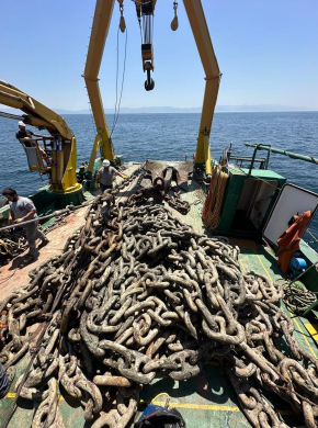 Yürütülen titiz çalışmalar neticesinde, 24 Haziran sabahı saat 09:00’da 7,5 ton ağırlığındaki çapa ve toplam 12 kilit (78 mm’lik) zincir deniz zemininde bulunarak malya sistemine takılmıştır. Tonlarca ağırlıktaki bu devasa ekipmanlar, teknemizin donanımında yer alan ırgat, hiyap ve A-frame gibi yüksek kapasiteli kaldırma sistemleri yardımıyla güvenli bir şekilde su yüzeyine çıkarılarak güverteye alınmıştır.